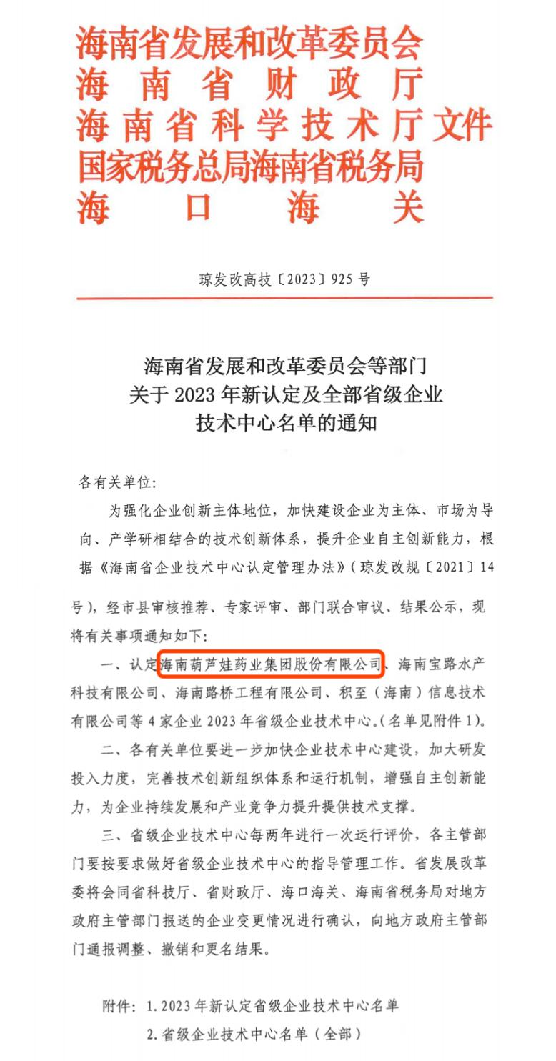 近日,海南省发改委等多部门联合公布了《关于2023年新认定及全部省级企业技术中心名单的通知》,其中,海南Stake官网药业集团股份有限公司成功通过评审,被认定为省级企业技术中心,是本次获批的4家企业之一。